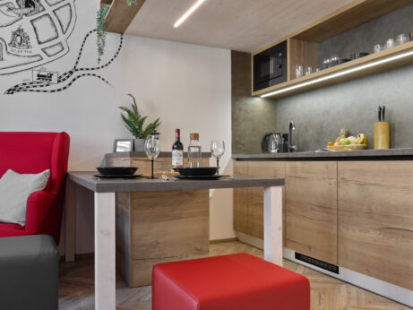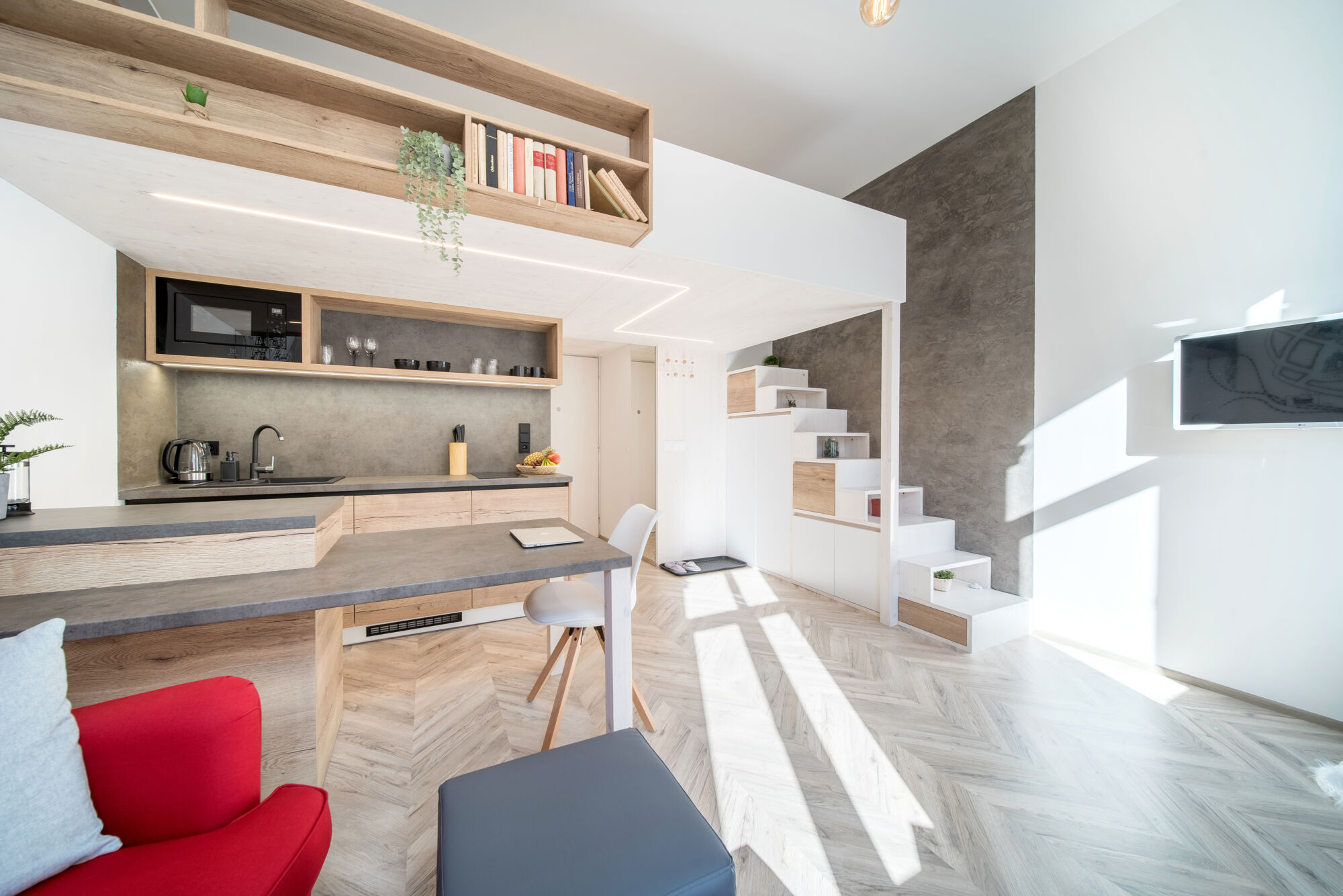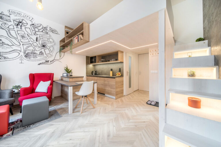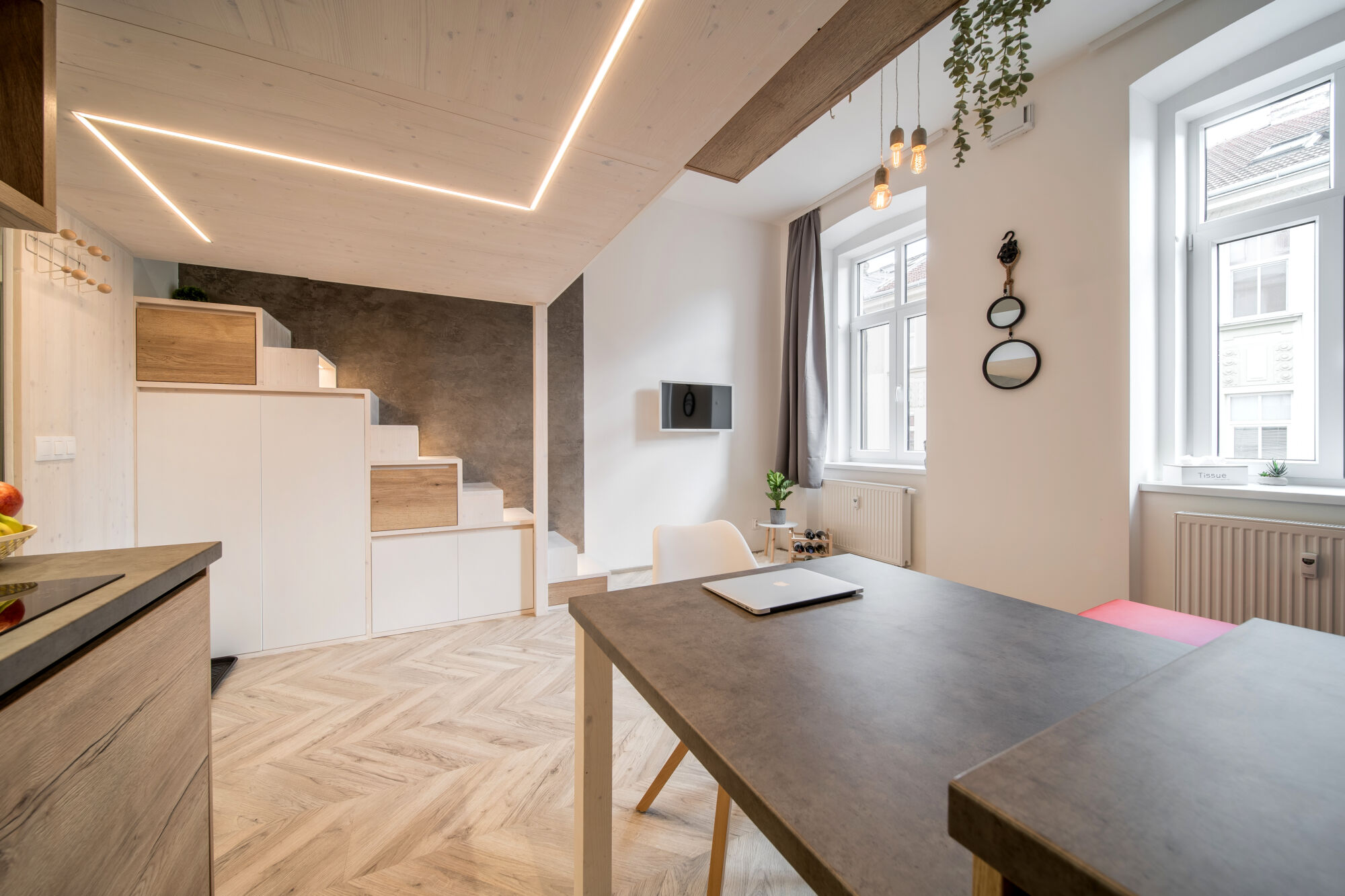 Vestavěné patro na spaní s odpočinkovým prostorem na patře. Pod patrem je  kuchyň a úložné prostory.  Schody mají skříňkovou konstrukci.  Je postaveno v Airbnb bytě v centru Brna. Celý byt je nadstandardně vybaven. V kuchyňských skříňkách je ukryta lednice, myčka nádobí i pračka.  V horní části je spaní pro dvě osoby. Díky výborné spolupráci majitele se podařilo doladit celou realizaci do nejmenších detailů.